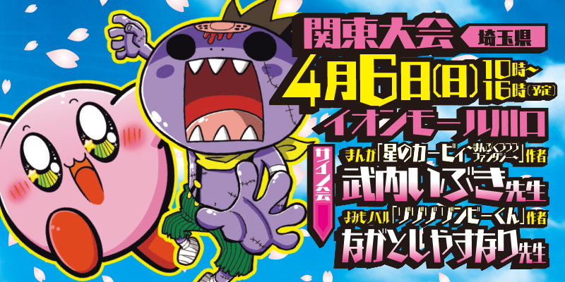4月6日(日)イオンモール川口で行われる「関東大会」では、『星のカービィ まんぷくプププ ファンタジー』の武内いぶき先生と『ゾゾゾゾンビーくん』のながとしやすなり先生が参戦だ!!