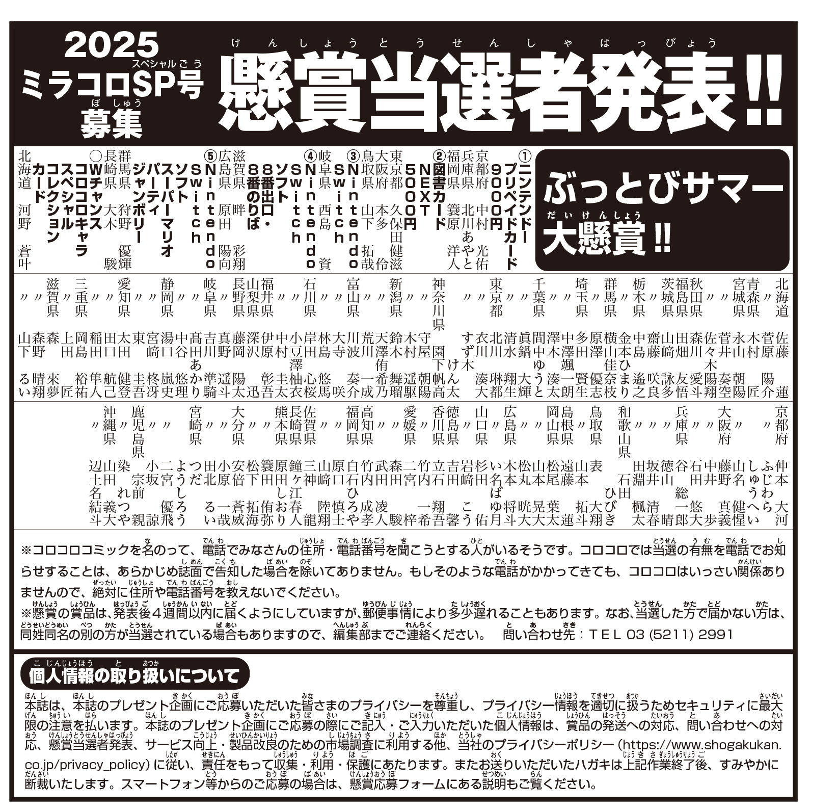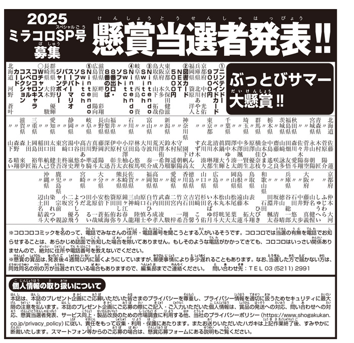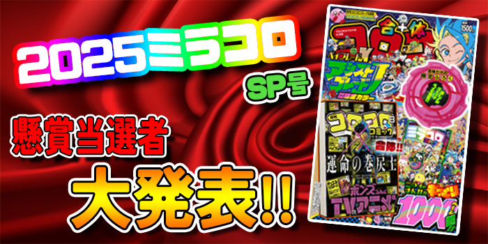 2025ミラコロSP号「ぶっとびサマー大懸賞!!」募集懸賞当選者発表!! 2025年11月06日 17:00 #懸賞当選者発表 2025年7月15日ごろに発売の月刊コロコロコミック8月号+ミラコログランプリ「ぶっとびサマー大懸賞!!」で募集した、各懸賞の当選者を発表! 下の画像をクリックして確認してみよう!!