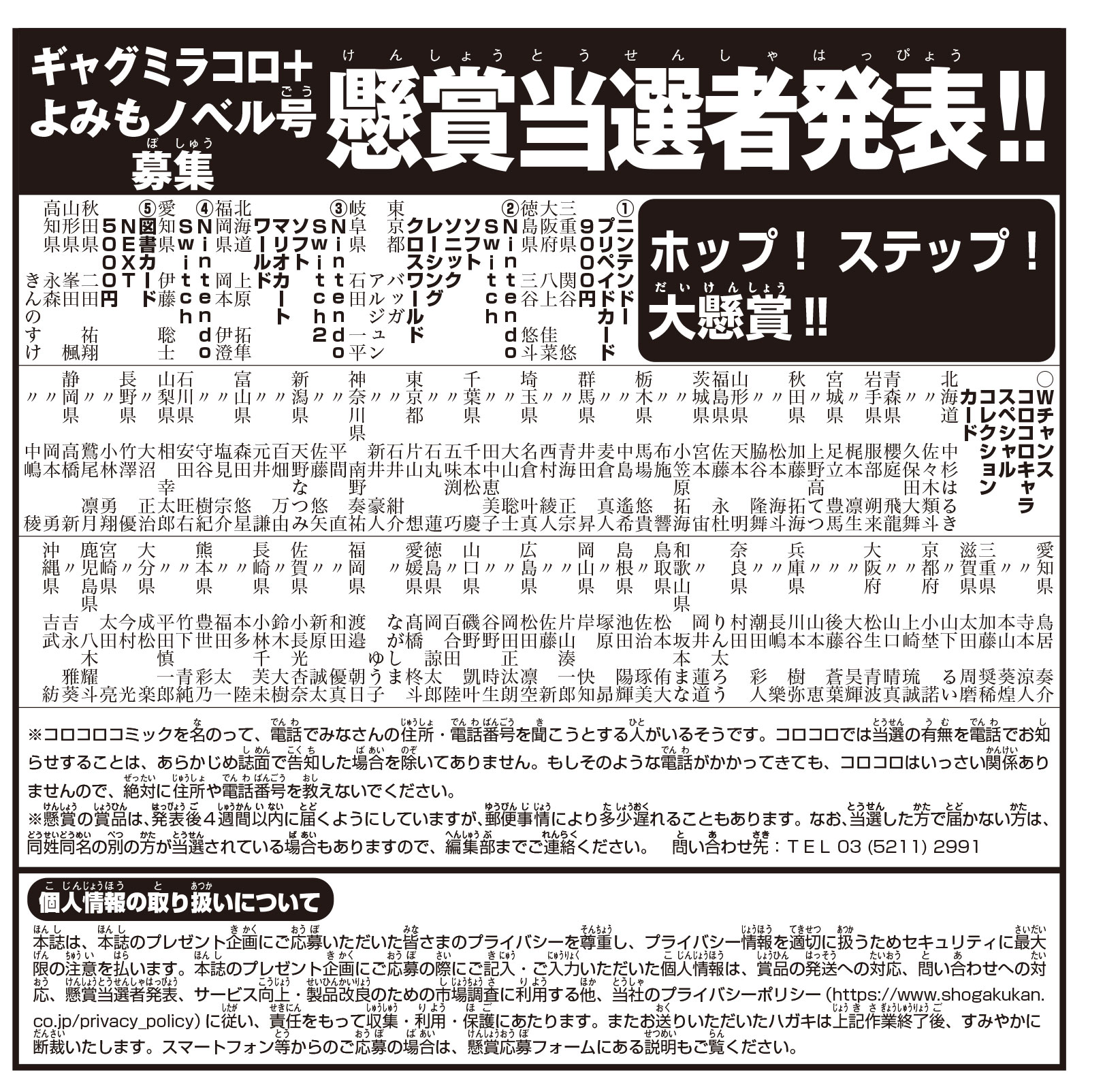 月刊コロコロ10月号+ミラコログランプリ&よみもノベルグランプリ「ホップ! ステップ! 大懸賞!!」懸賞当選者発表について募集懸賞当選者発表!! 2025年12月31日 17:00 #懸賞当選者発表 2025年9月12日ごろに発売の月刊コロコロコミック10月号+ミラコログランプリ&よみもノベルグランプリ「ホップ! ステップ! 大懸賞!!」で募集した、各懸賞の当選者を発表! 下の画像をクリックして確認してみよう!!