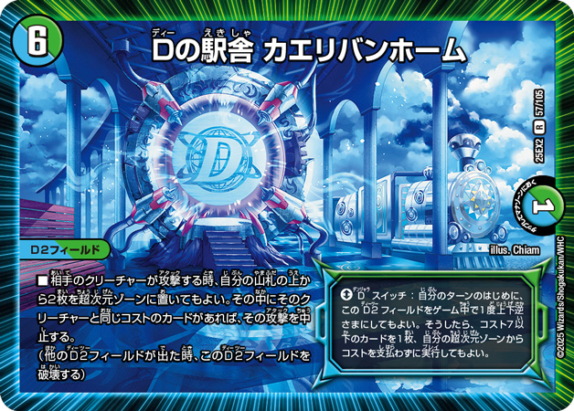 ↕Dスイッチ:自分のターンのはじめに、このD2フィールドをゲーム中で1度上下逆さまにしてもよい。そうしたら、コスト7以下のカードを1枚、自分の超次元ゾーンからコストを支払わずに実行してもよい。