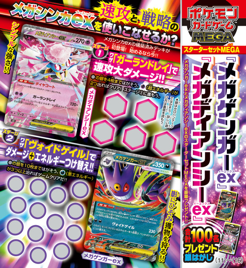 また、今月号の銀はがしでは、『ポケモンカードゲーム MEGA』「スターターセットMEGA メガゲンガーex」「スターターセットMEGA メガディアンシーex」等が、合計で100名にあたるぞ!
