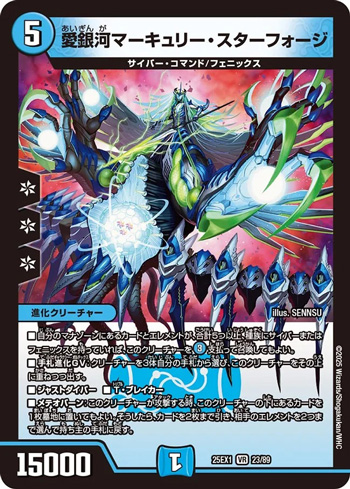 また、パートナーメタの突破は端的に「パートナーメタの持ち主を倒してしまうこと」によっても実現できる。そのためには「出たターンに攻撃できるT・ブレイカー」がどれだけデッキにいるかが重要で、この点《愛銀河マーキュリー・スターフォージ》は《愛銀河マーズ・シンギュラリティ》と合わせて相手を強引に倒せる突破力をもたらしてくれる。