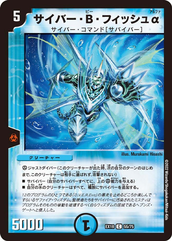 《神化混成 ボルナティックス》は「EXライフ」があるので除去系のS・トリガーに対しても耐性があるとはいえ、「G・ストライク」のことまで考えると何らかの方法で完全耐性を持たせられればより確実なフィニッシュが可能となる。《サイバー・B・フィッシュα》は水のクリーチャーすべてに「ジャストダイバー」を付与できるので、 《神化混成 ボルナティックス》着地の前のターンに出せば、より確度の高い連続攻撃が可能となる。