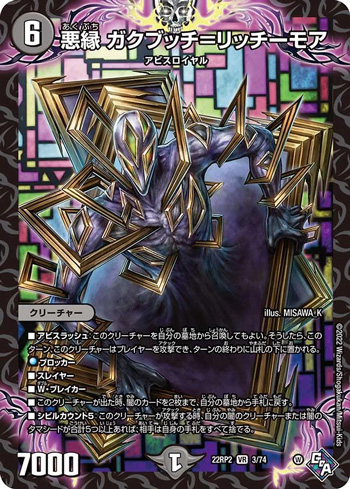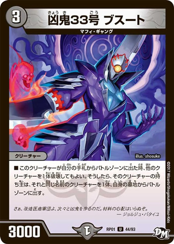 とはいえ《凶鬼33号 ブスート》の能力は踏み倒しでも発動するとはいえ「手札から」の着地時限定であり、《百鬼の邪王門》から出すとハズレになってしまうため手札に抱える必要があり制約が厳しいところ、《悪縁 ガクブッチ=リッチーモア》も合わせて採用することで、《百鬼の邪王門》などで墓地に落ちた《凶鬼33号 ブスート》を回収して改めて手札から出し直すことが可能となる。