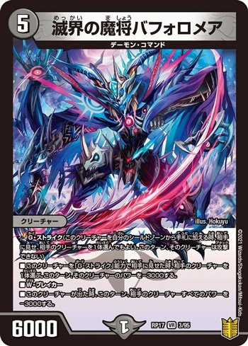 《滅界の魔将バフォロメア》はフリースロットだが、《百鬼の邪王門》を唱える構造上デッキ内に《鬼ヶ伝双 VSジャオウガ》と《凶鬼33号 ブスート》以外で一定枚数の非進化クリーチャーが必要であり、かつ《異端流し オニカマス》を対処できるものが望ましいため、今回は採用に至った。