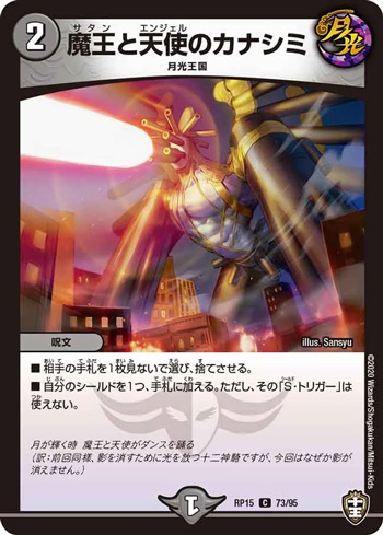 前者を解決する手段としては、《魔王と天使のカナシミ》に白羽の矢が立った。単色2コストのランダムハンデスに実質1ドローが付いた超強力な呪文だが、1種4枚しか積めないのと、クリーチャーではないため《百鬼の邪王門》との相性がそれほど良くない、というのがあった。