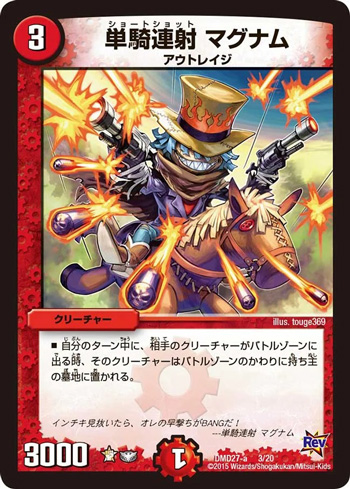 最初に思いつくのは《単騎連射 マグナム》だろう。これで大部分のS・トリガーを封殺できる……だが、本当だろうか?唱えた《百鬼の邪王門》は手札に戻せるが、既に攻撃している《鬼ヶ伝双 VSジャオウガ》はこれからW・ブレイクしようとしている。呪文のS・トリガーで《鬼ヶ伝双 VSジャオウガ》がやられてしまったら、あるいはスパーク系のトリガーでクリーチャーがすべてタップされてしまったら?そもそも、殿堂カードの《単騎連射 マグナム》を、たった1回の《百鬼の邪王門》で都合よく見つけられるだろうか?