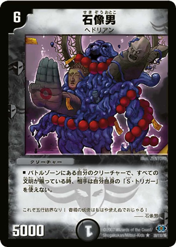 《石像男》は自分のバトルゾーンにすべての文明が揃っていれば相手の「S・トリガー」をクリーチャーだろうと呪文だろうとタマシードだろうとすべて封殺できる。それでいて《百鬼の邪王門》で出せるということで、要求をすべて満たしている。