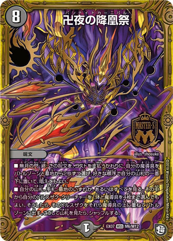1ターン目に《ブリザド=ザルド》を出して手札を空にしてしまうということは、確定しているリソースは墓地に捨てた3枚しかない。ではこの3枚をリソースにするにはどうするか。1ターン目に水マナをチャージしたいデッキで墓地がリソースになる……はっ!魔導具では???🤔🤔🤔というインスピレーションである。とはいえ普通に《卍 新世壊 卍》を設置しようとするとさすがに速度が怪しくなってしまうところ、《卍夜の降凰祭》であれば3ターン目始動も夢ではない。