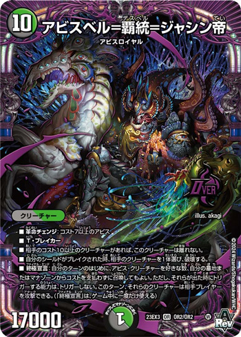 《ブリザド=ザルド》は7コストの「アビス」なので、《アビスベル=覇統=ジャシン帝》へと「革命チェンジ」させられる。そして《アビスベル=覇統=ジャシン帝》の「終極宣言」は墓地からもアビスを出せるので、1ターン目に捨てたアビスたちを見事にリソースとして活用することができる。