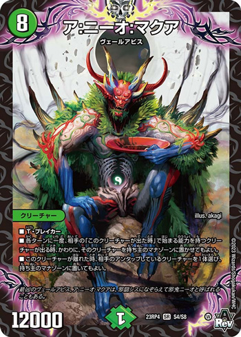 デッキに入るアビスは《巨大設計図》の制約で7コスト以上が望ましいが、「終極宣言」で大量のアビスを一度に踏み倒せるとはいえ、トリガーケアの要素も欲しい。そこにきて《ア:ニーオ:マクア》は、単色でありながらその要請を完璧に満たしてくれる。