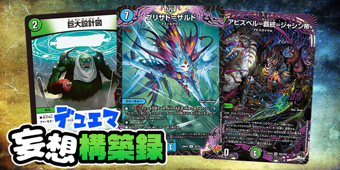《ブリザド=ザルド》《アビスベル=覇統=ジャシン帝》《シス=魔=シャル》はすべて7コスト以上のクリーチャーなので、《巨大設計図》軸でデッキを作ると綺麗にまとまる。《ブリザド=ザルド》自体を1種4枚しか積めないのと、《ブリザド=ザルド》を召喚するのに手札の枚数が必要なのも噛み合っている。