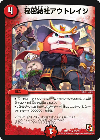 《終止の時計 ザ・ミュート》はドローできるアウトレイジでかつ強力なS・トリガーでありながら、これまでは使用がためらわれる理由があった。2ターン目に「パワード・ブレイカー」持ち、3ターン目にアウトレイジと展開して《秘密結社アウトレイジ》を持っていた場合、3ターン目のアウトレイジが「スピードアタッカー」持ちでない限りダイレクトアタックまでは持っていけない。ゆえに《一掃する炎上 デロリアン》が重宝されていたわけだが、いくら「スピードアタッカー」持ちのアウトレイジとはいえ、ドロー効果も何もないデメリット持ちをデッキに入れるのはおふざけが過ぎている。