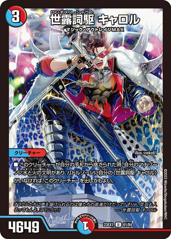 そうなると捨てる火のカードにもバリューを持たせたいところだが、《世露詞駆 キャロル》に加えて《粋と雨衣 ケローラ》まで採用することで、仮にS・トリガーによる反撃を食らった場合でも相手の初動を先んじて妨害しながらのワールド・ブレイクになるので、《終止の時計 ザ・ミュート》と合わせてターンをもらいやすい構造にできる。このありがたみは《秘密結社アウトレイジ》によるワンショットの場合だと実感しづらいが、クソビートプランの場合には特に重宝することだろう。