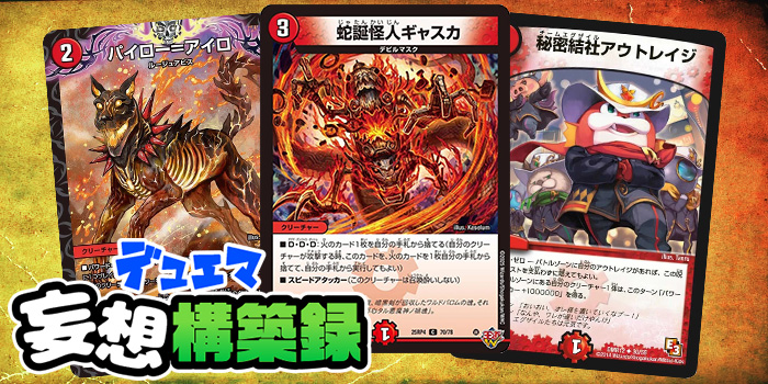 また、火水のアウトレイジには低コストでドローが可能なクリーチャーが数多く存在する。これらを組み合わせることで、「《秘密結社アウトレイジ》を引いたらワンショット」「引かなかったらクソビート」という2つのプランをハイブリッドしたデッキが完成する。そしてマナをかけずに打点を展開できる《蛇誕怪人ギャスカ》は、前者においてはダイレクトアタック要員を、後者においてはクソビート要員を担うことができるために、この2つのコンセプトの隙間を埋めるのにピッタリのカードなのだ。