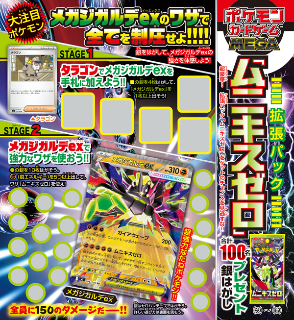 『ポケモンカードゲーム MEGA』からは、拡張パック「ムニキスゼロ」が1BOX6名、1パック94名の合計100名に当たるプレゼント銀はがしを開催!