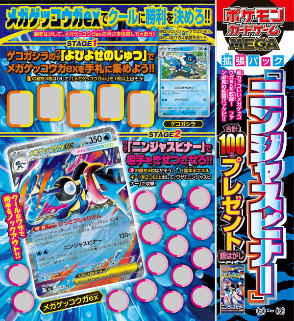 『ポケモンカードゲーム MEGA』からは、拡張パック「ニンジャスピナー」が1BOX6名、1パックが94名の合計100名に当たるプレゼント銀はがしを開催!