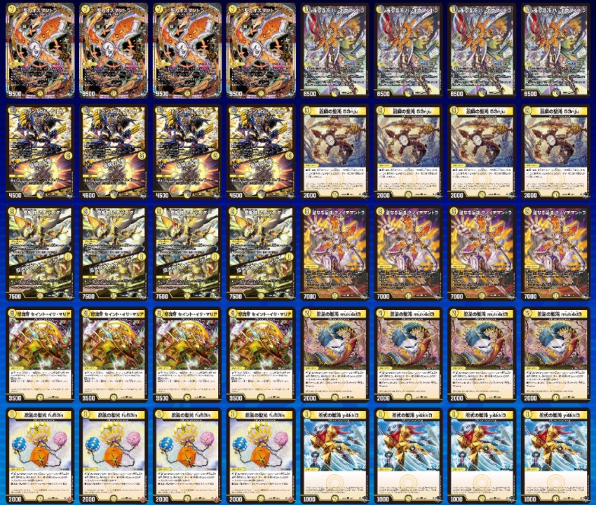 | 4 | 《忍式の聖沌 y4kk0》 | 4 | 《忍風の聖光 fu53n》 | 4 | 《忍足の聖沌 muk4d3》 | 4 | 《怒流牙 セイント・イサ・マリア》 | 4 | 《忍瞬の聖沌 53nju》 | 4 | 《星姫械 ミモザスター/招光呪文「メカミング」》 | 4 | 《ドラン・ゴル・ゲルス/豪龍の記憶》 | 4 | 《漲る混沌 ハッポウマントラ》 | 4 | 《聖なる混沌 クノイチマントラ》 | 4 | 《聖カオスマントラ》 |