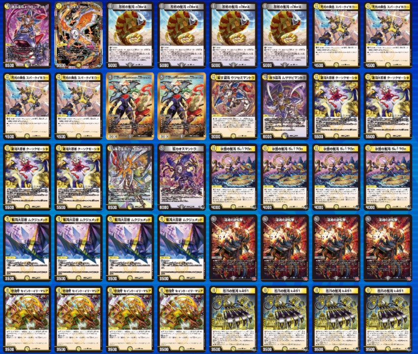 | 4 | 《怒流牙 セイント・イサ・マリア》 | 4 | 《忍爪の聖沌 k491》 | 4 | 《聖沌大忍者 ムクジュメッド》 | 4 | 《聖沌大忍者 クーソクゼーシキ》 | 4 | 《水雲の聖沌 5u170n》 | 4 | 《閃光の黄色 スパークイエロー》 | 2 | 《本能寺カレン&カオスマントラ ー裏切のヒロインー》 | 1 | 《漲る混沌 ハッポウマントラ》 | 1 | 《救う混沌 ムササビマントラ》 | 1 | 《躱す混沌 ウツセミマントラ》 | 1 | 《堕カオスマントラ》 | 4 | 《忍蛇の聖沌 c0br4》 | 1 | 《還る混沌 ドロロンマントラ》 | 1 | 《聖カオスマントラ》 | 4 | 《深淵の逆転撃》 |
