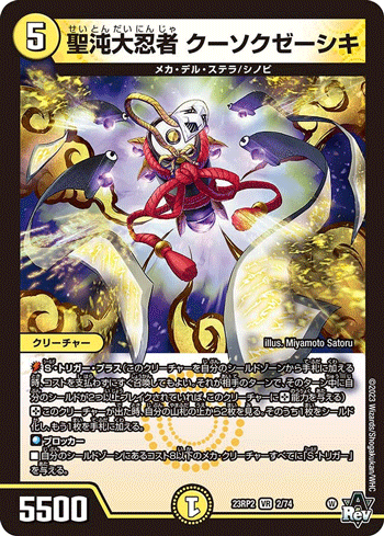 ところが「ニンジャ・チェンジ」の起点をなどの《聖沌大忍者 クーソクゼーシキ》や《水雲の聖沌 5u170n》などの強力な「S・トリガー」持ちクリーチャーにすれば、相手は攻撃を継続するためには攻撃ステップ中に「S・トリガー」で着地したクリーチャーを改めて除去する必要があることになり、ターンを稼ぎやすくなる。そしてそこに《怒流牙 セイント・イサ・マリア》が絡めば「ニンジャ・チェンジ」も引き込みやすくなり、仮に2ターン目からシールドを攻められようと「S・バック」「S・トリガー」「ニンジャ・チェンジ」の3段構えで攻めを撃退できるようになるのである。