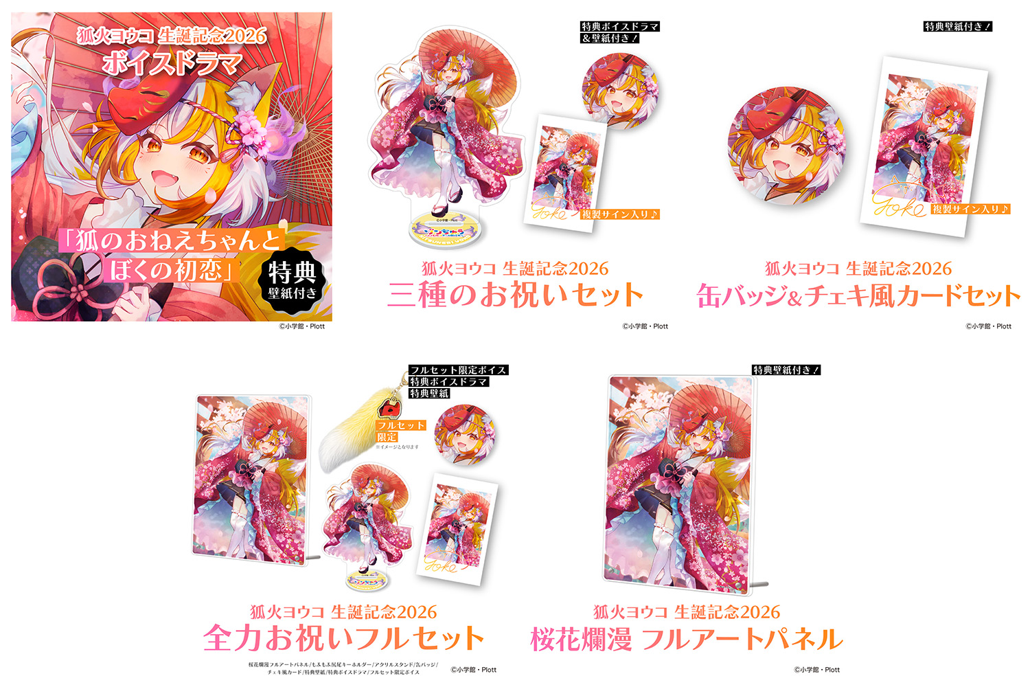 今回の狐火ヨウコ生誕記念2026グッズ&ボイスは、全部で6種類のセットのどれかを購入することで手に入れることができるぞ!