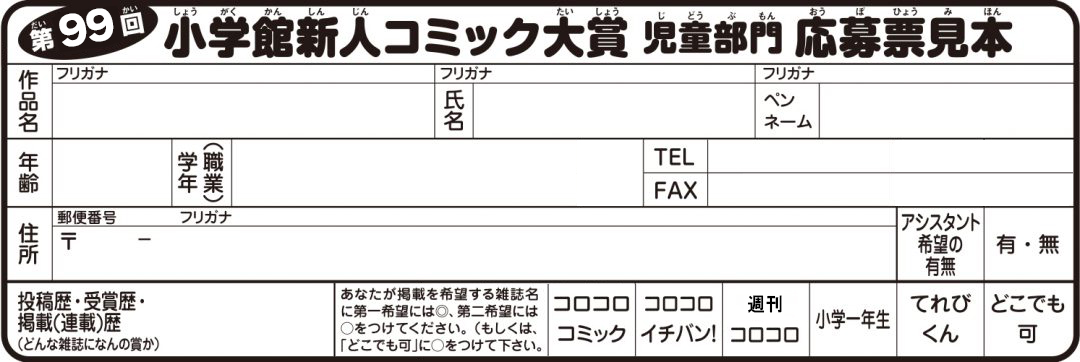 〒101-8001 東京都千代田区一ツ橋2-3-1 小学館「第99回新人コミック大賞」事務局 児童部門